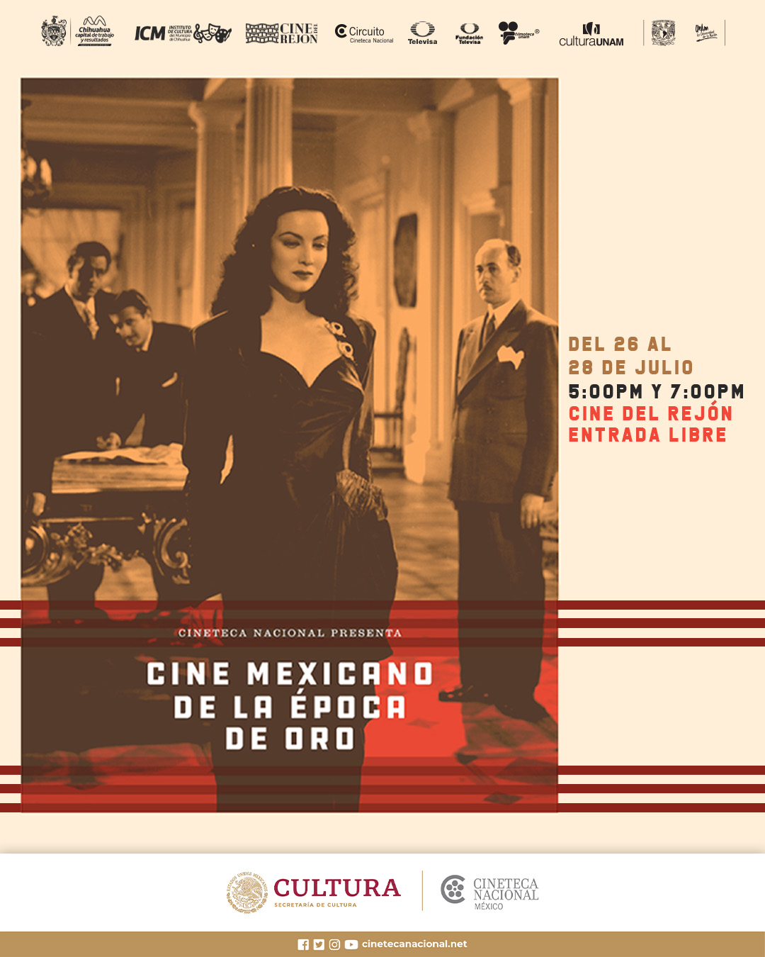 El Instituto de Cultura del Municipio en convenio con la Cineteca Nacional, le complace en anunciar el próximo ciclo de cine en el Cine Del Rejón, el quinto ciclo de cine que se realiza en este año. En esta ocasión, presentaremos un Ciclo de Cine Mexicano de la Época de Oro, una oportunidad única para disfrutar de clásicos cinematográficos que han marcado la historia del cine nacional.
